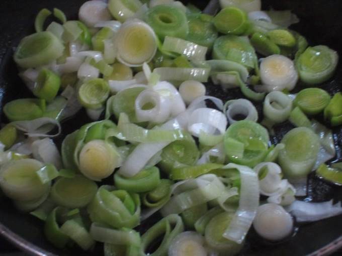 Лук-порей мелко нарезать и обжарить 2-3 минуты в 4 ст.л. оливкового масла. Влить нeмного тёплой воды, посолить, накрыть крышкой и тушить 10 минут. Остудить.