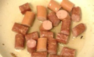 Колбаски охотничьи режим на колечки примерно 2-3 см, затем обжариваем на растительном масле.