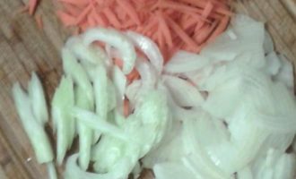 Подготовим продукты. Чечевицу отварить в соответствии с указаниями на упаковке. Лук, морковь, сельдерей — помыть, почистить, нашинковать соломкой.
