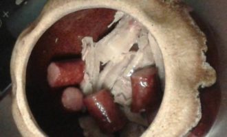 Далее слоями укладываем горшочек. Первым делом кладем мясо, затем колбаски.