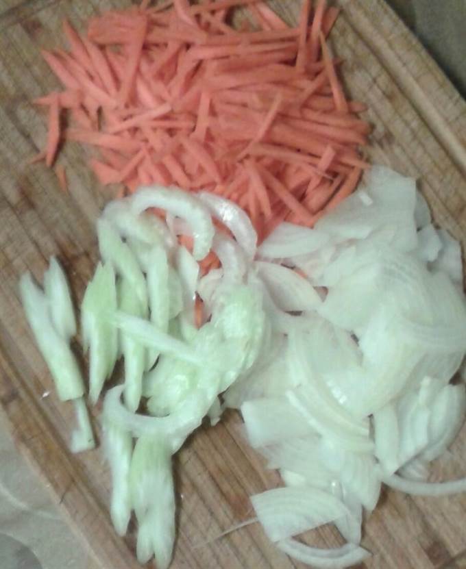 Подготовим продукты. Чечевицу отварить в соответствии с указаниями на упаковке. Лук, морковь, сельдерей — помыть, почистить, нашинковать соломкой.