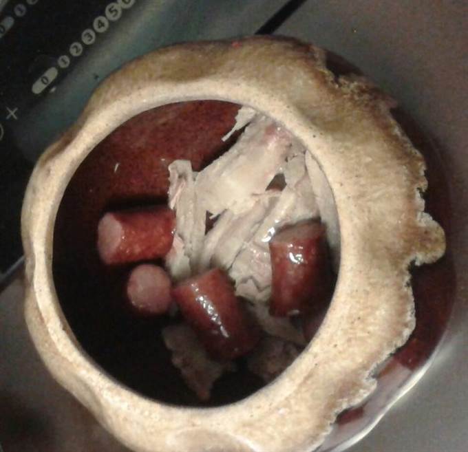 Далее слоями укладываем горшочек. Первым делом кладем мясо, затем колбаски.