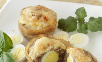 Сверху разложить оставшийся фарш так, чтобы яйца оказались внутри и были полностью покрыты фаршем. Сверху немного смазать майонезом или сметаной и посыпать тертым сыром.