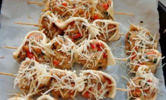 На деревянные шпажки наколоть тесто и слепленные мясные шарики. При желании посыпать их тертым сыром. Запекать в духовке при 200 градусах около 45 минут.