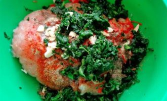 В фарш добавить зажарку, натертый лук, мелко порезанные чеснок, шпинат и болгарский перец, соль, перец черный, ваши любимые приправы. Все тщательно перемешать с одним яйцом.