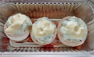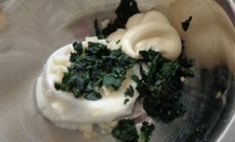 Шляпки шампиньонов начинить смесью творога, чеснока, майонеза, шпината, посолить и поперчить по вкусу.