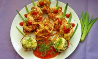 Готовые шарики в тесте выложить на тарелку, украсить по вкусу зеленью и соусом. Подавать с грибами и жареной картошкой.