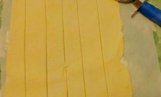 Один пласт слоеного теста (250 г) раскатать и разрезать на 6 частей.