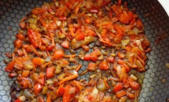 Почистить шампиньоны, шляпки присолить и отложить, а ножки мелко порезать и обжарить с тертой морковкой, болгарским перцем и луком. Посолить, поперчить, добавить приправы по вкусу.