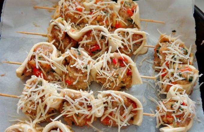 На деревянные шпажки наколоть тесто и слепленные мясные шарики. При желании посыпать их тертым сыром. Запекать в духовке при 200 градусах около 45 минут.