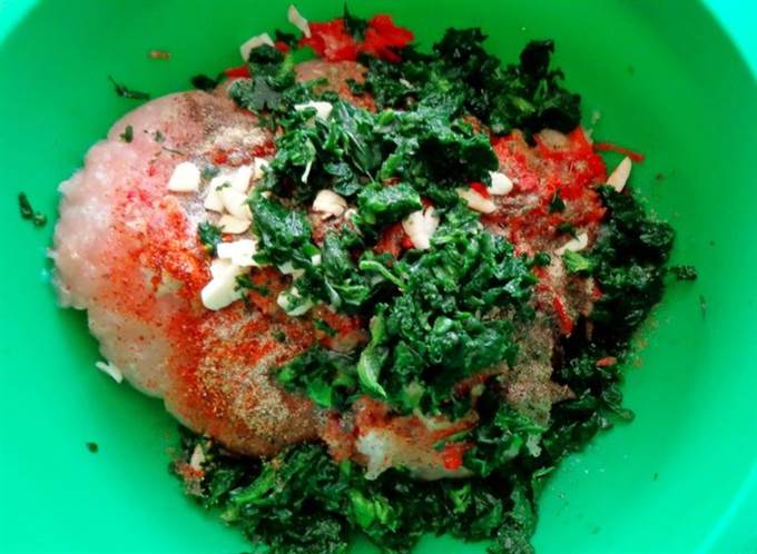 В фарш добавить зажарку, натертый лук, мелко порезанные чеснок, шпинат и болгарский перец, соль, перец черный, ваши любимые приправы. Все тщательно перемешать с одним яйцом.