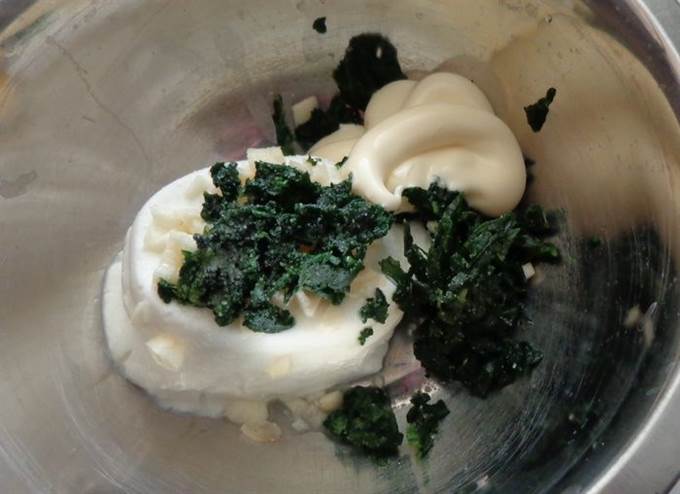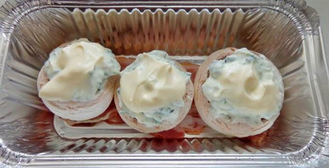 Шляпки шампиньонов начинить смесью творога, чеснока, майонеза, шпината, посолить и поперчить по вкусу.