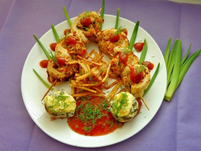 Готовые шарики в тесте выложить на тарелку, украсить по вкусу зеленью и соусом. Подавать с грибами и жареной картошкой.
