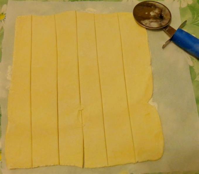 Один пласт слоеного теста (250 г) раскатать и разрезать на 6 частей.
