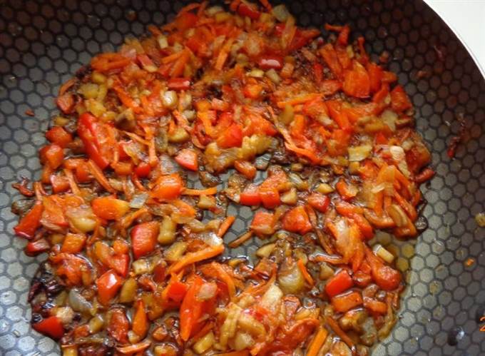 Почистить шампиньоны, шляпки присолить и отложить, а ножки мелко порезать и обжарить с тертой морковкой, болгарским перцем и луком. Посолить, поперчить, добавить приправы по вкусу.