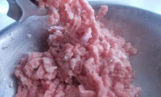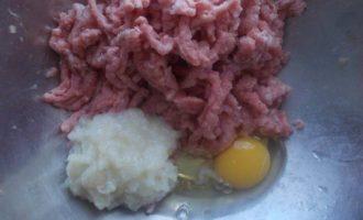 К фаршу помолоть луковицу и зубок чеснока. Добавить яйцо, посолить поперчить. Хорошо перемешать.