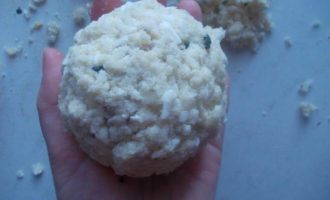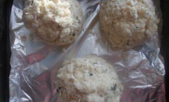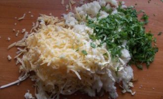 Приготовить крошку, для этого раскрошить руками мякоть батона, добавить тертый сыр и масло, рубленую зелень и измельченный чеснок. Посолить и поперчить.