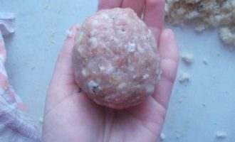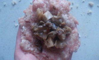 Смачиваем руки в воде, берем третью часть фарша, формируем лепешку, укладываем сверху грибочки.