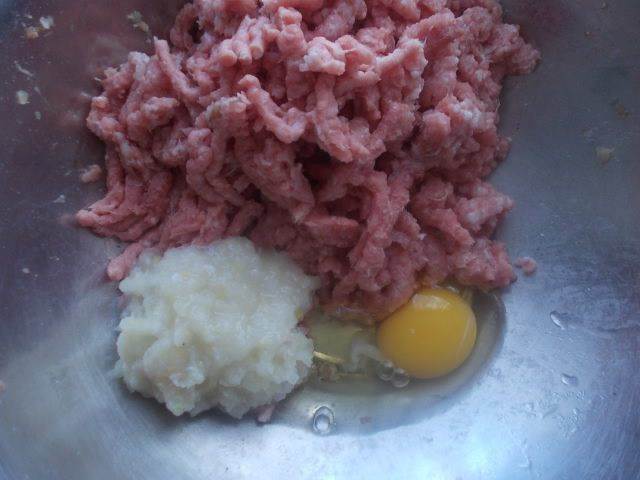 К фаршу помолоть луковицу и зубок чеснока. Добавить яйцо, посолить поперчить. Хорошо перемешать.