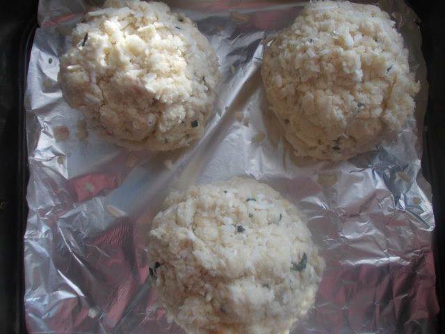 Приготовить крошку, для этого раскрошить руками мякоть батона, добавить тертый сыр и масло, рубленую зелень и измельченный чеснок. Посолить и поперчить.