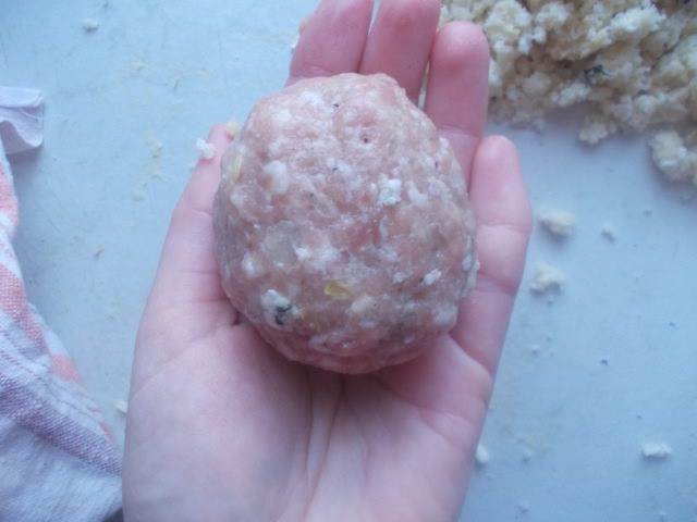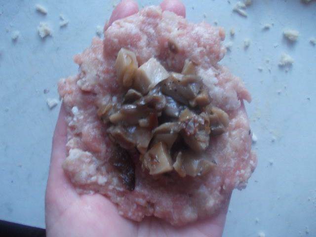 Смачиваем руки в воде, берем третью часть фарша, формируем лепешку, укладываем сверху грибочки.