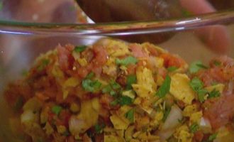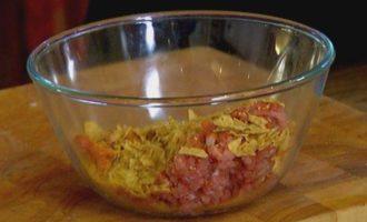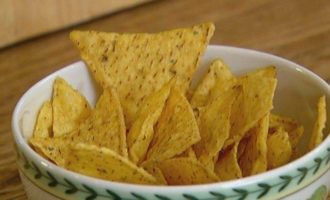 Кукурузные чипсы поломать руками на небольшие кусочки.