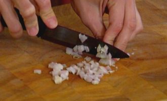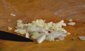 Кинзу и половину чеснока добавить в фарш, перемешать.