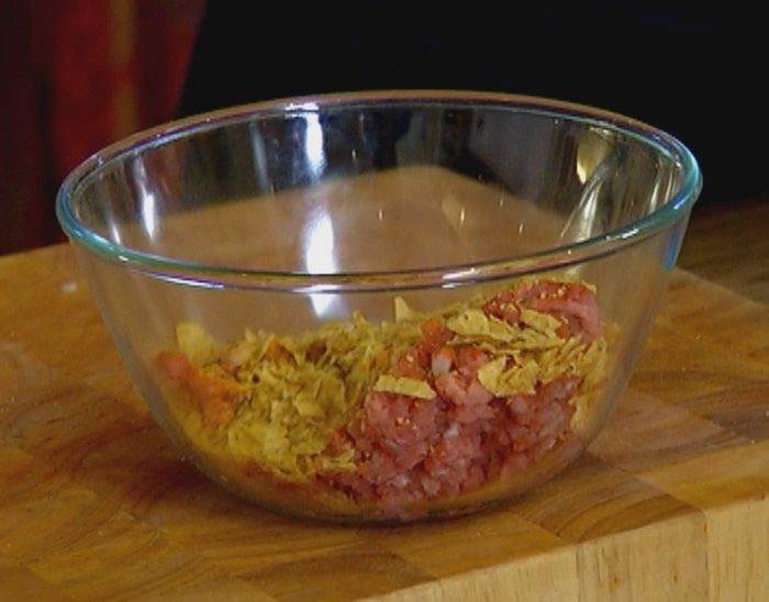 Весь фарш перемешать, добавить измельченный лук, тмин, чили, куркуму и измельченные чипсы, посолить, поперчить и еще раз перемешать.