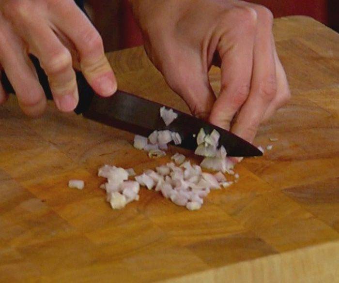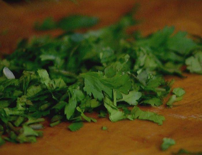 Кинзу и половину чеснока добавить в фарш, перемешать.