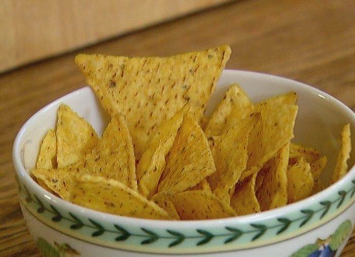 Кукурузные чипсы поломать руками на небольшие кусочки.