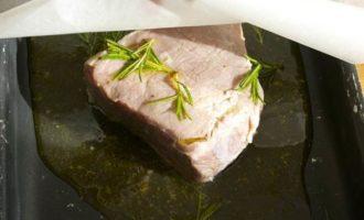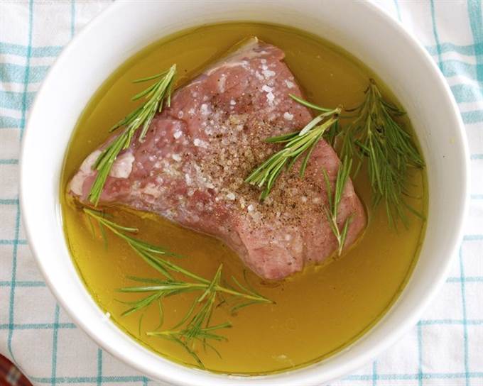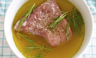 Замариновать кусок мяса минимум на 2 часа в смеси оливкового масла, белого винного уксуса, вина, соли и перца, с добавлением розмарина. Пару раз перевернуть.