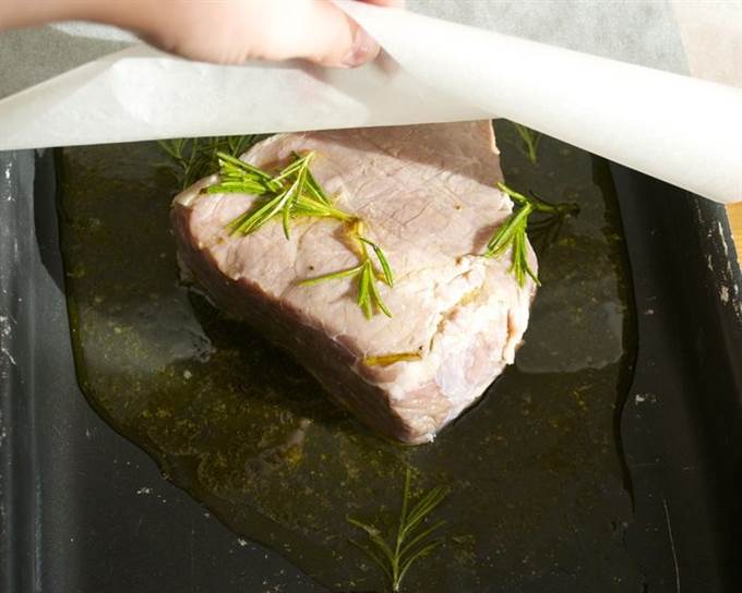 Затем выложить мясо на противень с высокими бортиками… Вылить на мясо часть маринада. И закрыть большим листом пекарской бумаги…