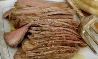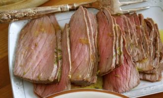 Подавать с зеленым салатом, нарезав мясо тонкими ломтиками (как ростбиф).