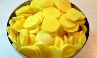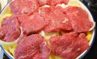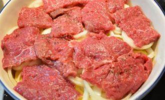 Смазать форму растительным маслом. На дно выложить треть картофеля, сверху — половину лука. Посолить.