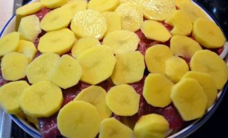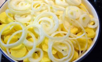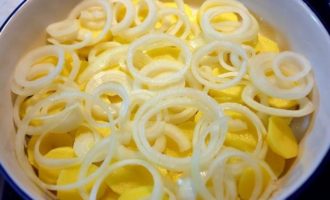 Повторяем слои: еще треть картофеля, другая половина лука — посолить.