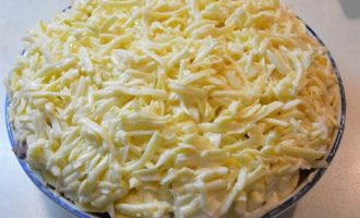 Покрыть сверху сырным соусом. Для такого количества ингредиентов нужно брать блюдо побольше (у меня 28 см), потому что сыр немного потек при запекании.