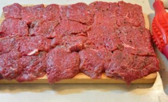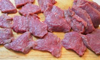 Мясо нужно брать не жилистое, лучше мякоть. Нарезать мясо пластинами.