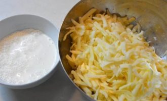 Сыр натереть на терке. Смешать сметану, сыр и сливки.