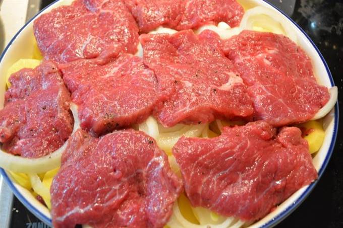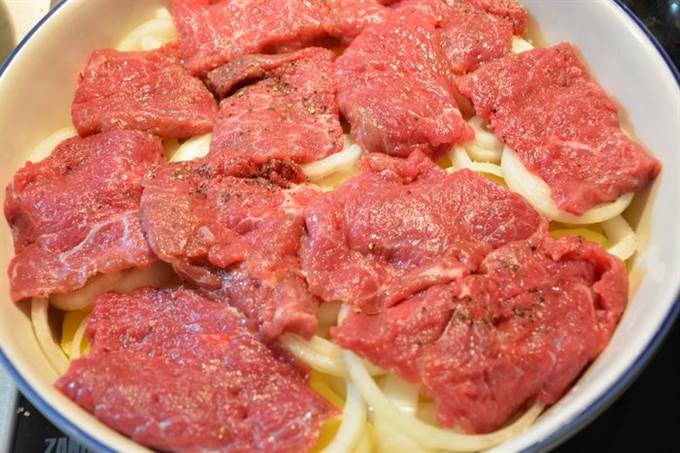 Смазать форму растительным маслом. На дно выложить треть картофеля, сверху — половину лука. Посолить.