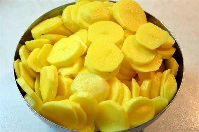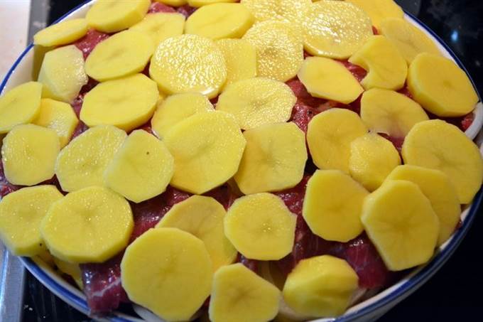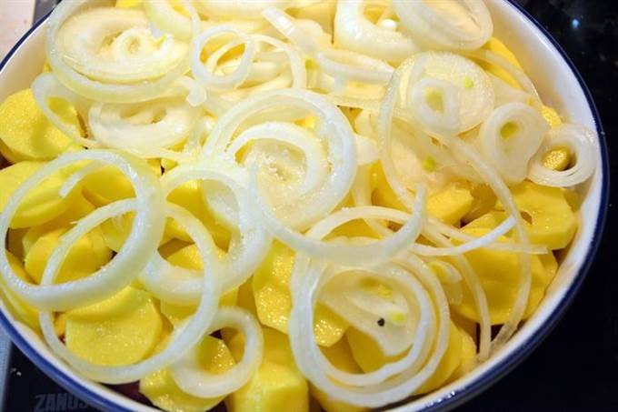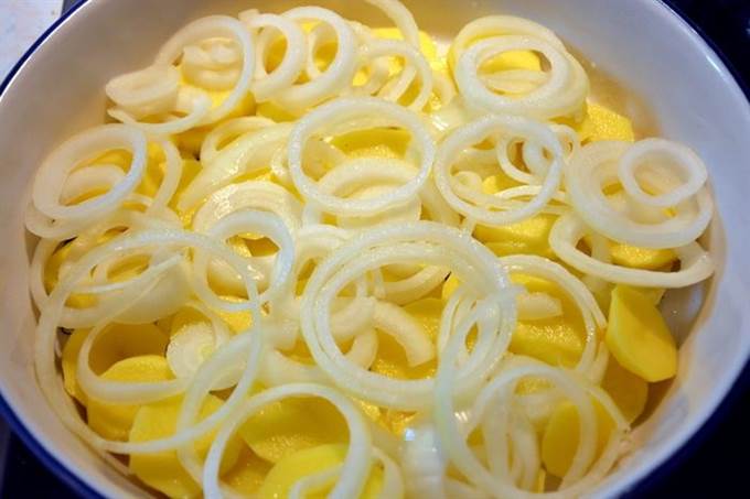 Повторяем слои: еще треть картофеля, другая половина лука — посолить.