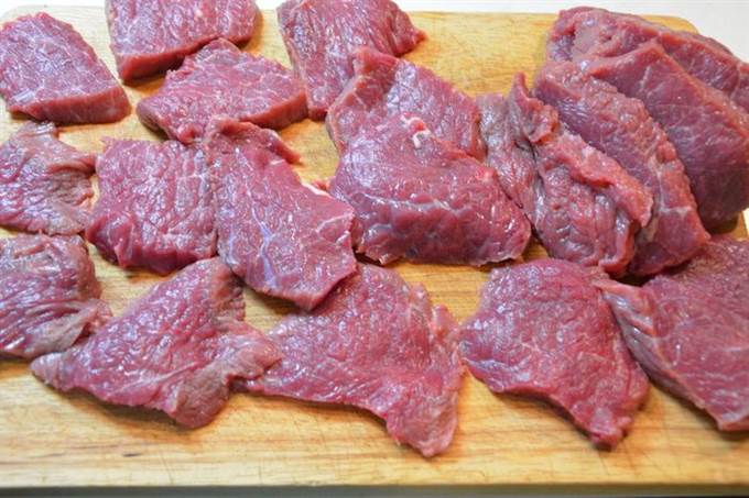 Мясо нужно брать не жилистое, лучше мякоть. Нарезать мясо пластинами.