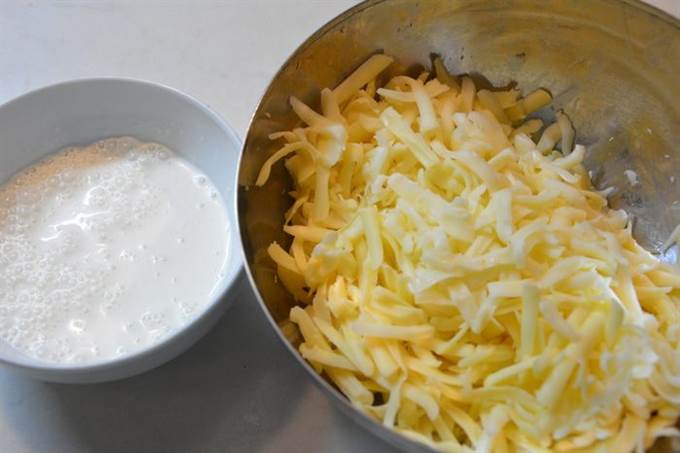 Сыр натереть на терке. Смешать сметану, сыр и сливки.