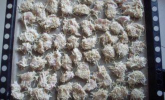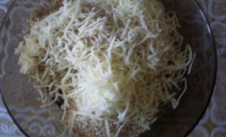 Натереть на терке сыр. Смешать 100 грамм сыра с отрубями и панировать кусочки курицы. Сыр кончится раньше отрубей, т.к. они сползают вниз. Добавить оставшийся сыр и закончить панировку.