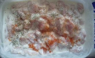 Замочить в кефире, добавить соль и специи по вкусу. Оставить минимум на 30 минут, а лучше на ночь в холодильнике. -