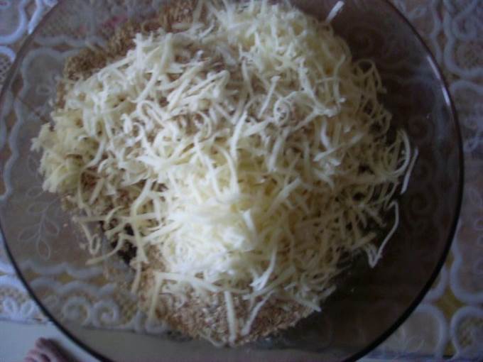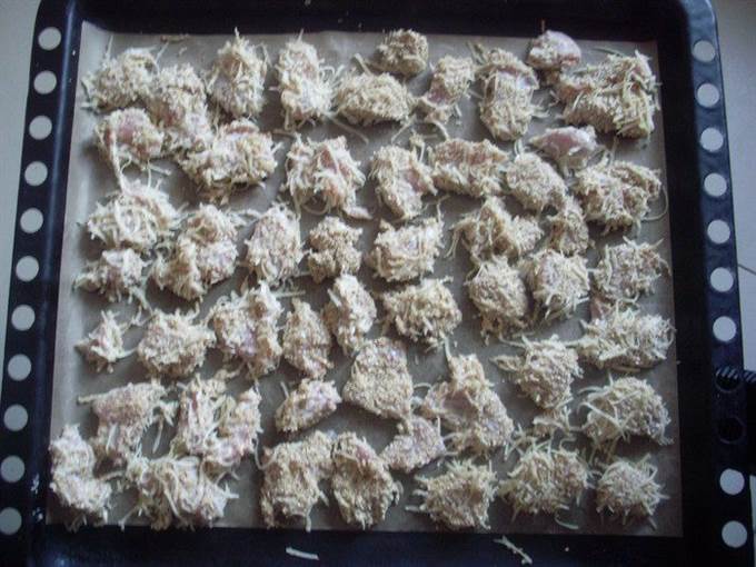 Натереть на терке сыр. Смешать 100 грамм сыра с отрубями и панировать кусочки курицы. Сыр кончится раньше отрубей, т.к. они сползают вниз. Добавить оставшийся сыр и закончить панировку.