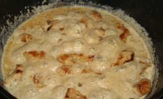• Выложить филе в сливки и тушить под закрытой крышкой 15 минут.
