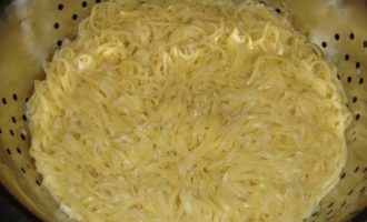 • В подсоленной воде отварить яичную лапшу. Слить воду.