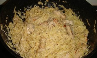 • Лапшу выложить в сковороду и аккуратно перемешать с мясом. Прогреть пару минут. Разложить пасту по тарелкам и посыпать рубленой петрушкой.
