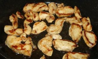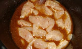 • Куриное филе промыть и нарезать полосками. Выложить кусочки филе в кастрюльку и перемешать с маринадом. Убрать в холодильник на 1 час.