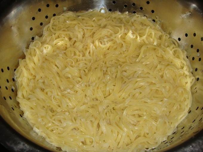 • В подсоленной воде отварить яичную лапшу. Слить воду.